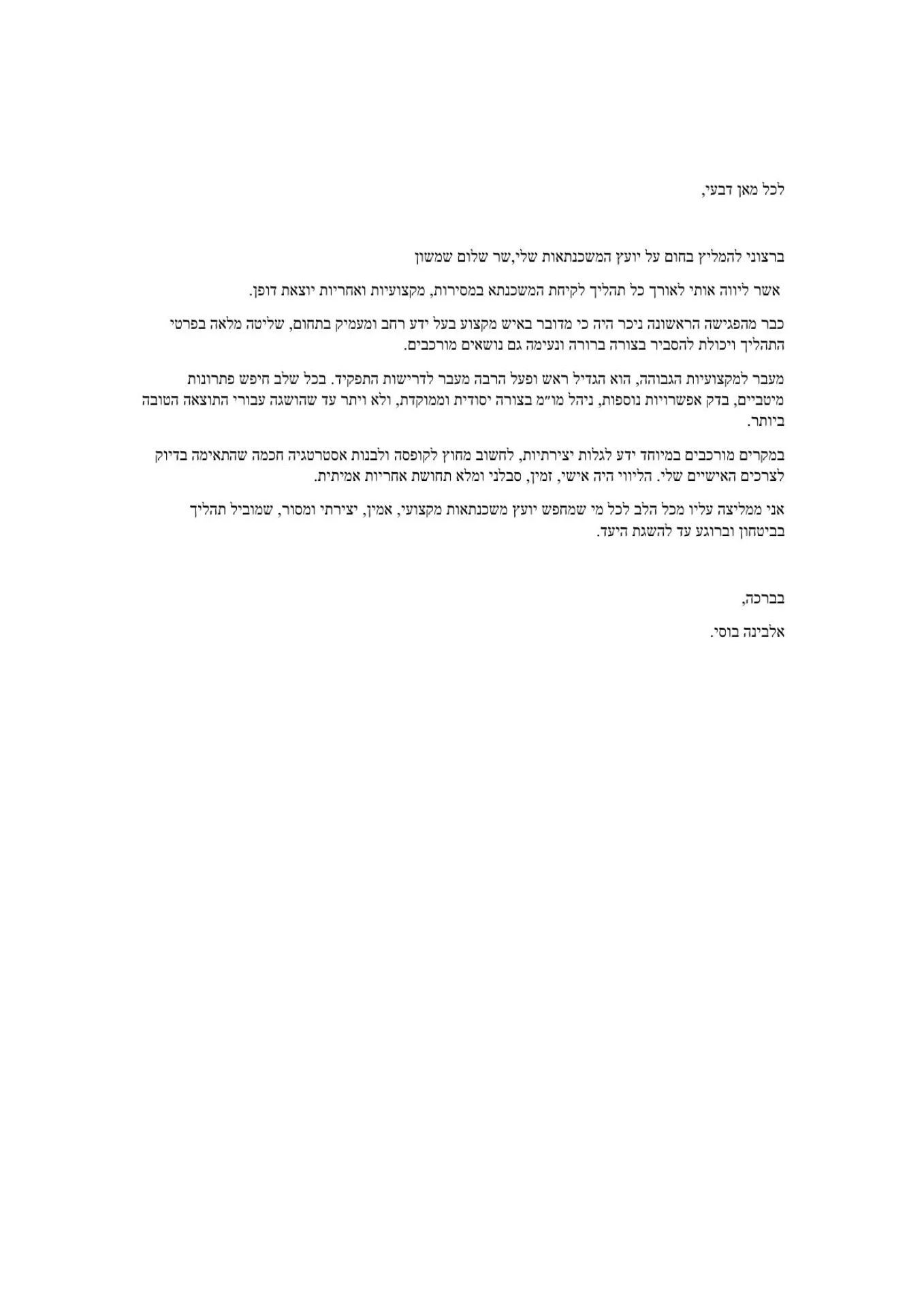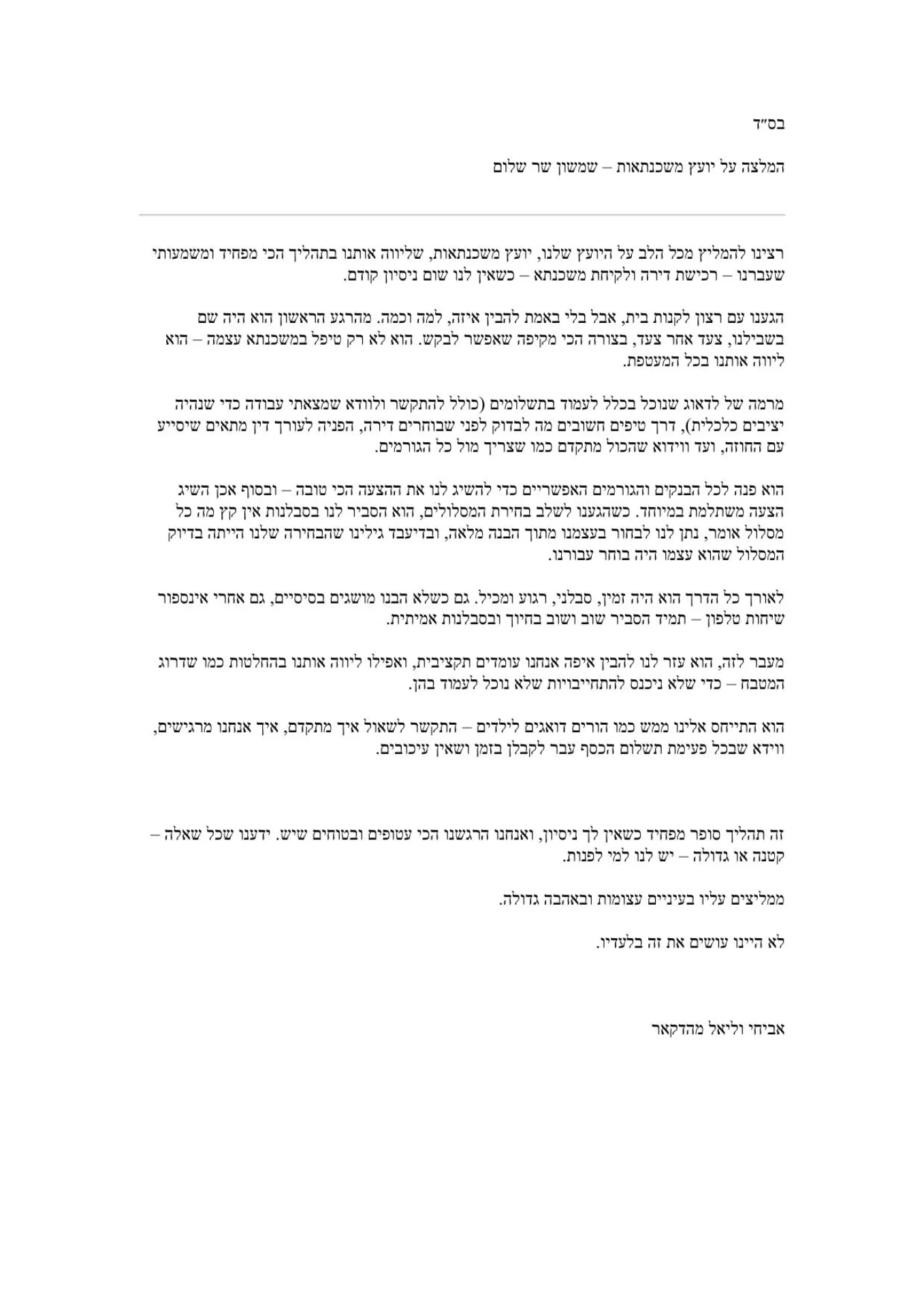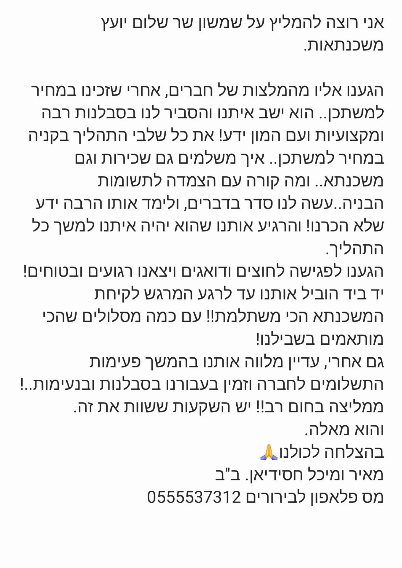 "כנראה שאין מילים שיכולות באמת לתאר את התודה שאנחנו חבים לשמשון. הגענו אליו כזוג צעיר שזכה ב'מחיר למשתכן' לדירה ראשונה. מהרגע הראשון, האנושיות והיושרה שלו בלטו מיד: בניגוד לאחרים שדרשו מחירים מופקעים על הפגישה הראשונה, שמשון דיבר איתנו בגובה העיניים וגבה סכום הוגן שלא השתנה. הזמינות שלו הייתה מעל ומעבר – גם בשעות לא שגרתיות, בערבי שבתות וחגים, הוא תמיד היה שם כדי להסביר, להרגיע ולהוציא מאיתנו את הלחץ והבלבול.